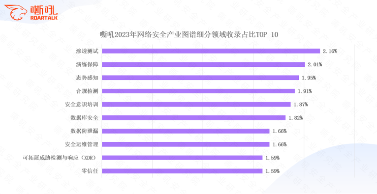 网络安全产业是当今数字化时代不可或缺的重要领域,其中细分赛道的发展更是引人注目。本次图谱调研报告显示,排名TOP10的细分领域与收录占比分别是:渗透测试2.16%、演练保障2.01%、态势感知1.95%、合规检测1.91%、安全意识培训1.87%、数据库安全1.82%、数据防泄露(DLP)1.66%、安全运维管理1.66%、可拓展威胁检测与响应(XDR)1.59%、零信任1.59%,在网络安全产业中占据一定的热度与重要性。