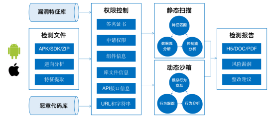 方案依托移动应用合规检测工具,依据国家行业标准指南和监管政策规范等,通过对移动应用APP进行逆向分析和源代码还原,采用静态特征匹配、动态行为分析、人机交互模拟和数据流关联分析等多种自动化检测方式,从个人隐私保护条款、第三方SDK访问权限、异常行为分析和敏感行为风险等多个角度,发现移动应用程序中存在的不合规情况和个人隐私泄露风险。根据检测结果,给出有效的修改建议和解决方案,供开发者进行整改,确保移动应用满足监管合规要求,保障移动应用的可持续发展。